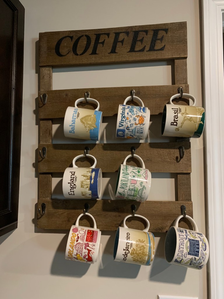 Another fun collection of mine, is my Starbucks “You are Here” mugs. I’m sure you’ve seen these in your local Starbucks. These are gorgeous coffee cups with beautiful and colorful designs that capture what that city is best known for. I don’t know how many I have, but I love displaying them on my rustic coffee sign. I change them out every now and then to feature different places. I don’t have a favorite and please don’t make me choose.