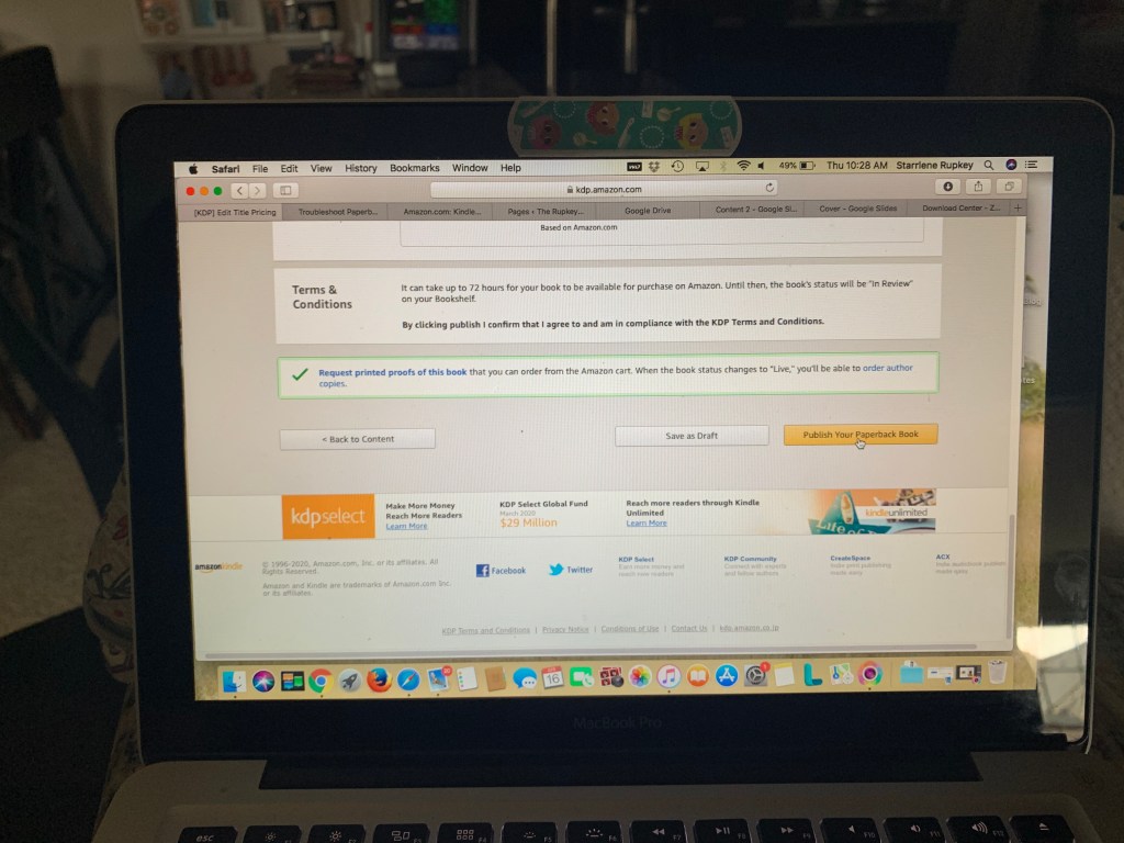 Next, we needed to upload to the publishing site. Our first upload had 55 errors. (I was expecting more to be totally honest.) Most of the errors consisted of pictures and text being outside of the margins of the page. After revisions, our second upload had 15 errors. Our third upload had one error: the cover. The cover had to be uploaded separately and we just couldn’t figure out how to get it the correct size, centered, and showing the picture and text.